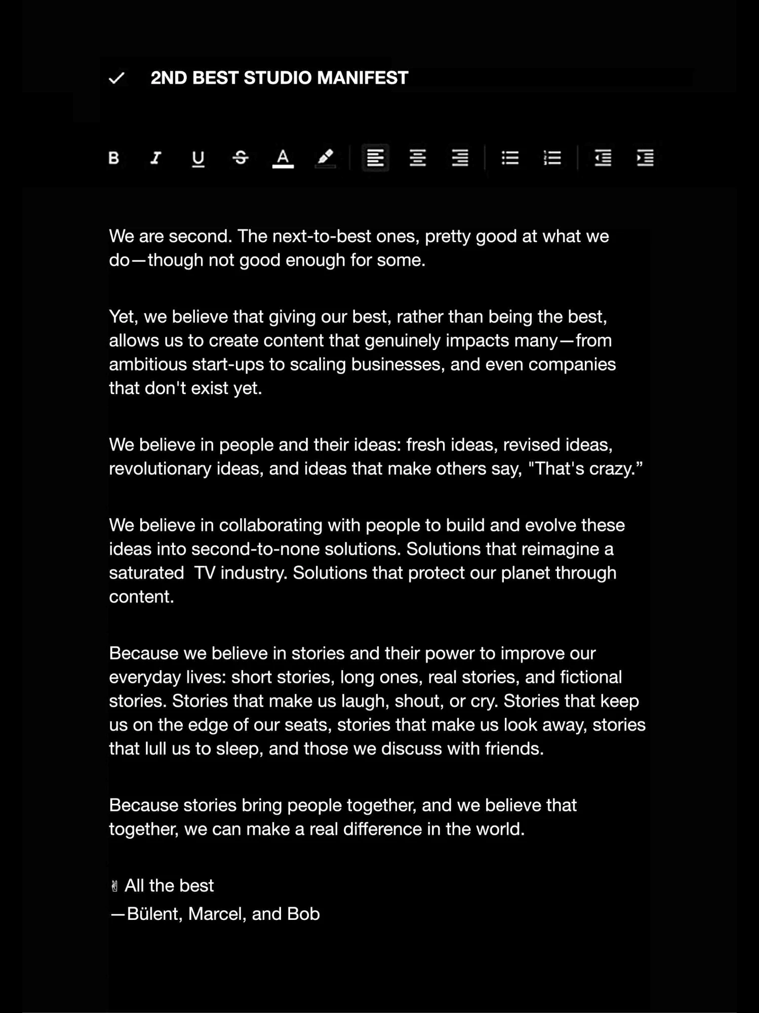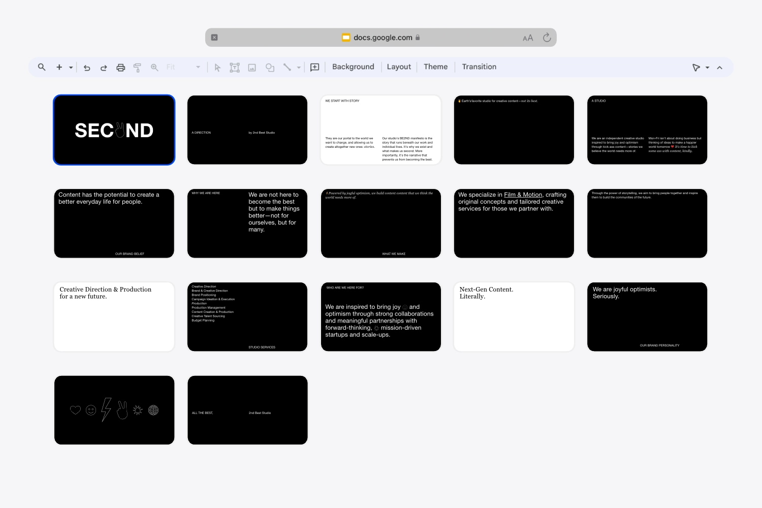 2nd Best Studio required more than a strong identity. It called for a strategic foundation that could hold ambition, experimentation, and growth at the same time. The work focused on translating the studio’s values into a system that informed both creative output and internal rhythm.