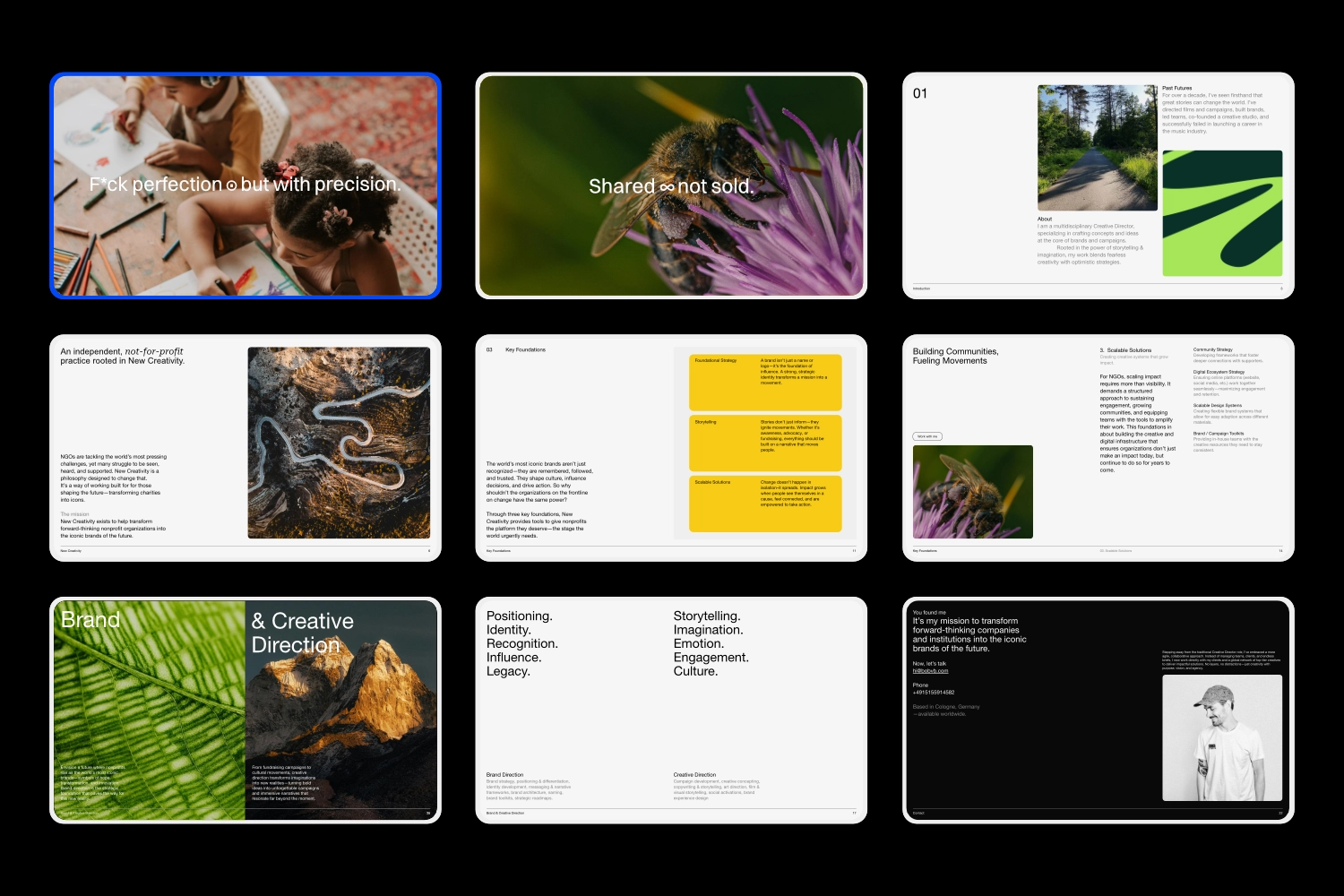 As Executive Creative Director/Head of Studio, I developed a unified strategic vision that embedded purpose into creative operations. This included defining positioning, shaping narrative direction, and building a brand system that supported a wide range of work—from cultural projects to NGO collaborations—while remaining coherent and recognizable.